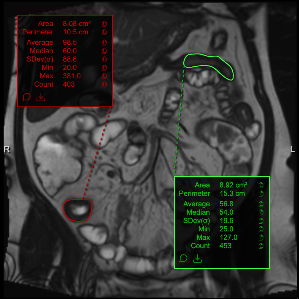 While MRI is a powerful test for showing where the disease is (small bowel vs colon) and what the disease is doing (penetrating or stricturing), it cannot, without the help of measurement tooling, show how the disease is responding, for example to therapy or intervention.